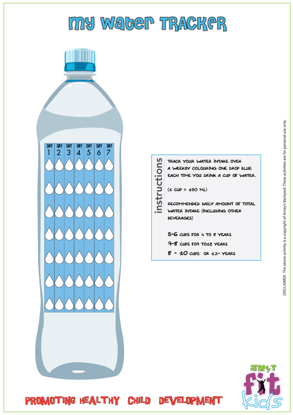 Track your water intake over a weekly colouring one drop in BLUE, each time you drink a cup of water